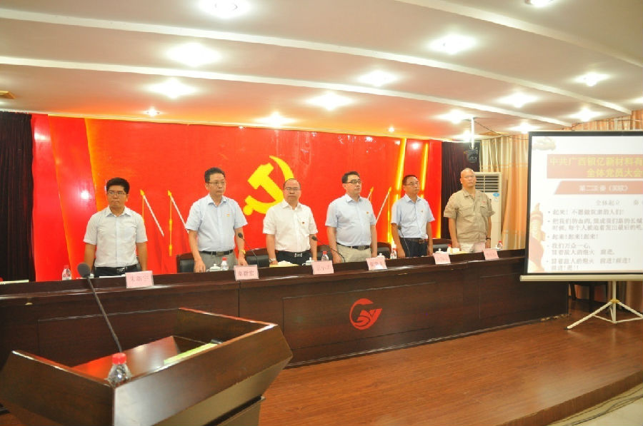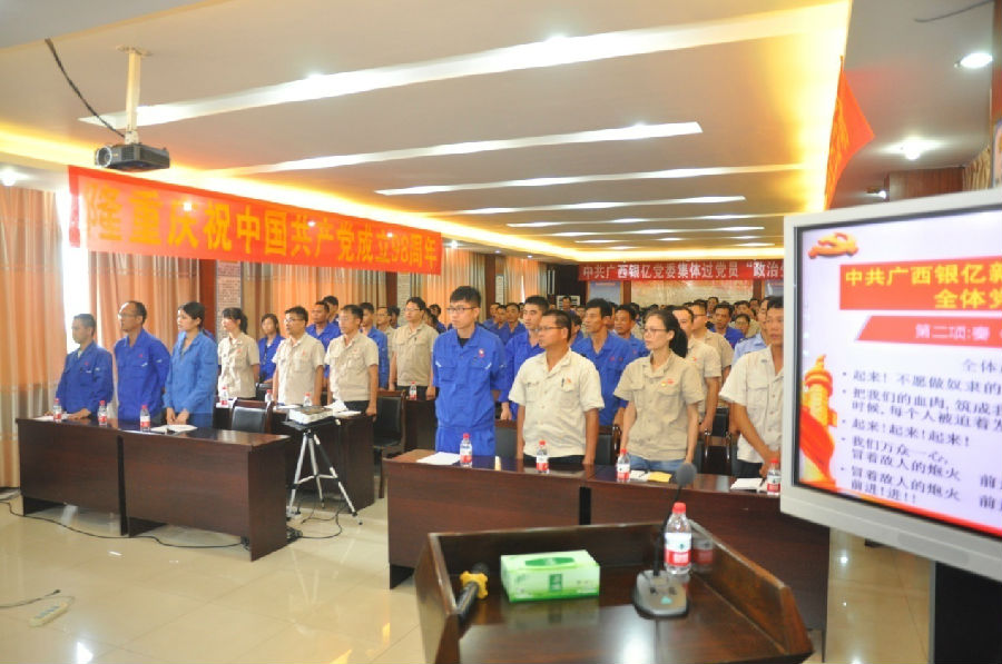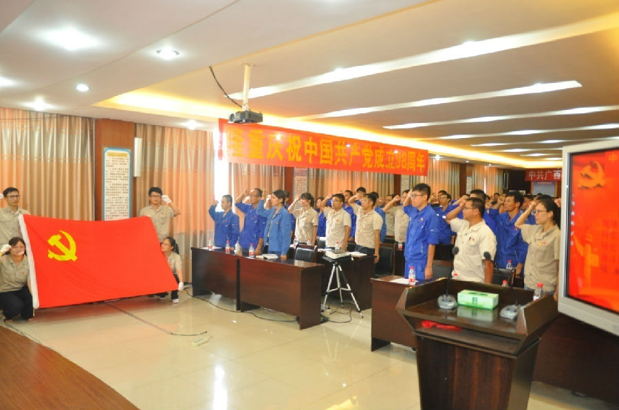 為慶祝中國共產(chǎn)黨成立98周年,回顧黨的光輝歷程,謳歌黨的偉大成就,牢記黨的光榮使命,7月1日,廣西銀億黨委以“不忘初心,牢記使命”為主題隆重舉行了慶祝中國共產(chǎn)黨成立98周年暨“七·一”黨員大會。參加此次大會的有黨委書記王小豐、黨委副書記張學(xué)飛、黨委副書記章群宏、黨委委員陳為清、邀請了黨外民主人士副總經(jīng)理楊瑋光、總經(jīng)理助理朱新宇、廣西銀億全體黨員、積極分子,到會共計105人。此次會議由黨委副書記章群宏主持。會議內(nèi)容由四部分組成: